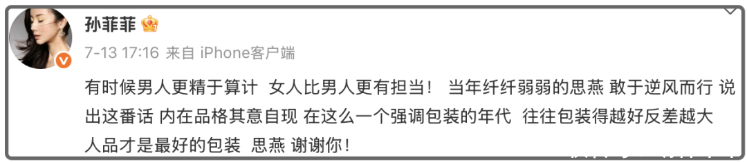 而针对当时坊间传闻孙菲菲太爱越俎代庖,从而导致了这场纷争,霍思燕却表示,以她对孙菲菲的认识,这种说法完全不属实。并且还称如果有孙菲菲需要,她会第一时间给予帮助,势必要讨回公道。