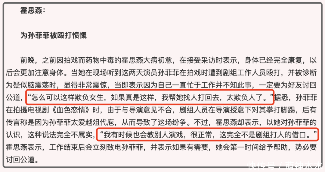 据悉,当年孙菲菲被霸凌一事引发社会关注后,霍思燕第一时间并不知情,而是在媒体采访时才知道此事,得知孙菲菲被打成脑震荡后更是直接怒斥剧组:“怎么可以这样欺负女生,如果真是这样,我帮她找人打回去,太欺负人了。”