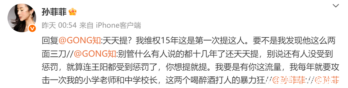不过霸凌事件过去了多年,孙菲菲还是没能完全走出当年的阴影,尤其是王阳遭背刺一事,更是让孙菲菲连续发文怒斥王阳和他的大V粉丝。
