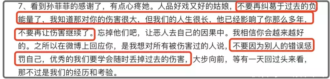 而于正看到孙菲菲特意发文感谢自己后,也亲自回应了孙菲菲,他对孙菲菲的这些经历表示心疼,人品好戏也好,不过希望孙菲菲不要再纠葛过去的负能量,即便霸凌事件对孙菲菲伤害很大,但人生很长,不要再让伤害继续了。而自己之所以发文回应孙菲菲,其实也是想对所有被伤害过的人说,不要因为别人的错误惩罚自己,要学会随时丢掉过去的伤害。